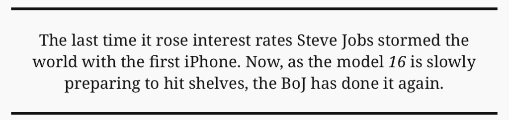 After almost two years of above-target inflation, the BoJ finally decided that enough is enough. The last time it rose interest rates Steve Jobs stormed the world with the first iPhone. Now, as the model 16 is slowly preparing to hit shelves, the BoJ has done it again.