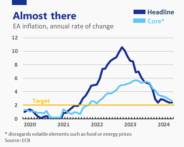 Tight financing conditions and the reversal of energy shocks seem to have tamed the record-high inflation figures between 2022-23. The energy crisis galvanized by Russia’s aggression on Ukraine is all but an unpleasant memory, with energy prices having deflated for the last year. Headline inflation currently stands at 2.4%.