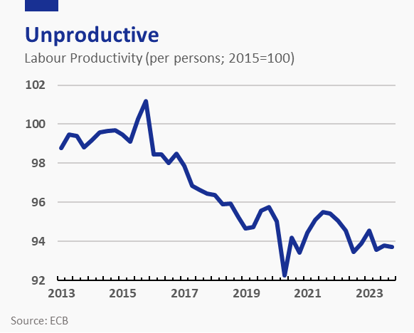 Productivity is at a falling trend in the eurozone. Apart from skilled labour shortages, it has been exacerbated by low rates of innovation and creative destruction, especially by the part of small and medium-sized companies (SMEs). SMEs comprise a majority share of all firms in the eurozone; due to having less access to economies of scale and adaptation to information technologies as their larger counterparts, they are more unproductive.