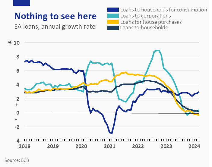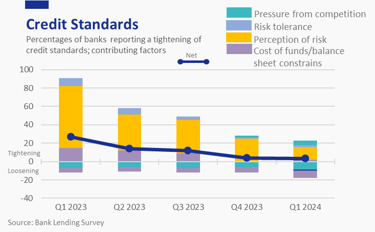 Furthermore, increased risk perception has prompted banks to adopt stricter credit standards in the last quarters. The latest Bank Lending Survey indicates a marginal tightening of credit standards, with loan growth rates remaining stable in the last quarters following a sharp decline between late 2022 and 2023.
