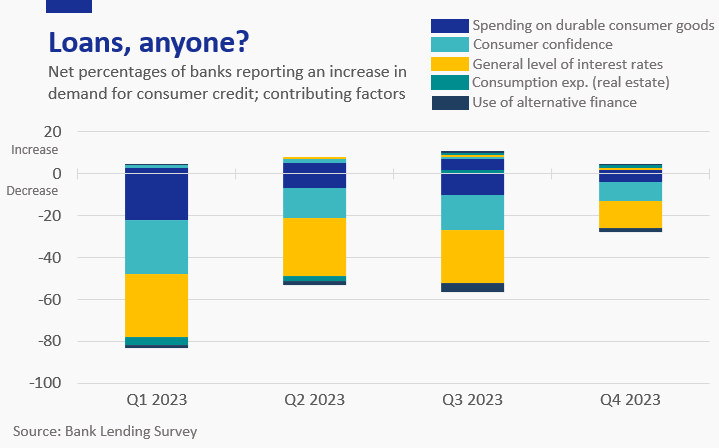 Downward pressure from low demand for loans is another contributing factor to the falling loan rate in the eurozone. Demand for consumer credit remained weak throughout 2023, although a gradual slowdown in low rates of demand between the first and final quarters of 2023 was perceived. Notably, consumer confidence and the general level of interest rates are the main factors thwarting demand.