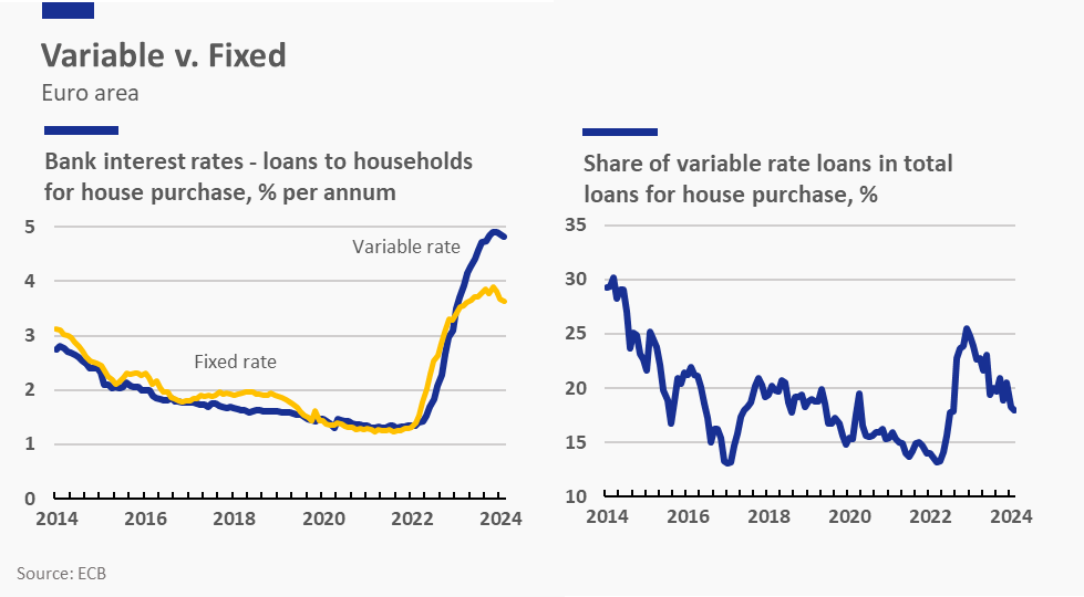 Moreover, the share of variable rates in total loans for house purchases has been in a falling trend in the last decade, leaving more room for slow-to-adjust fixed rates. This lag becomes apparent when observing the data: fixed rates currently stand an entire percentage point below variable rates. As such, the impact of high interest rates is yet to be fully transmitted into financing conditions. Notably, vastly asymmetric credit compositions within the euro area will result in varying impacts of the transmission mechanism between member states.