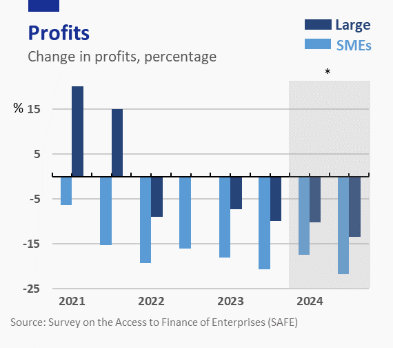 SMEs have found it more challenging to sustain their profit margins due to having less price-setting ability as large enterprises. Furthermore, although in 2023 firms were able to successfully internalize rising costs in their profit margins thanks to falling input costs (e.g. energy) in other areas, the expected normalization of these costs will increase the contribution of wage growth going forward. Moreover, low productivity figures could weaken firms’ ability to absorb rising costs in the long run.