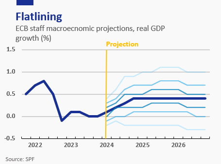 The euro area economy stagnated in the final quarters of 2023, although showed some surprising resilience as of Q1 2024 thanks to strong German exports. Economic growth previsions have been brought down to a meagre 0.4% for the upcoming years.
