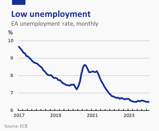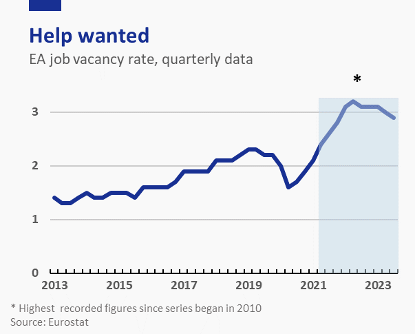The labour market in the euro area is exceedingly strong. The unemployment rate stands at a record low of 6.5%, which has never been seen in the history of the euro before. Moreover, the labour force participation rate is equally strong, indicating active participation from all members of the working-age population. Despite low unemployment figures and active participation, labour supply has been slow to adjust to the growing needs of euro area producers.