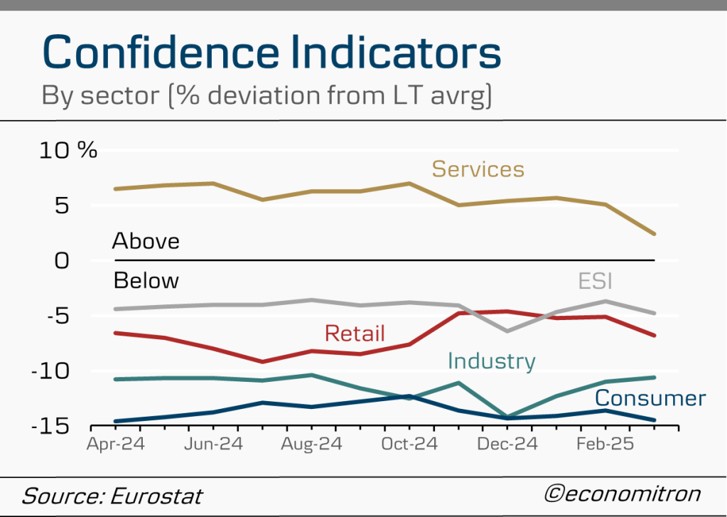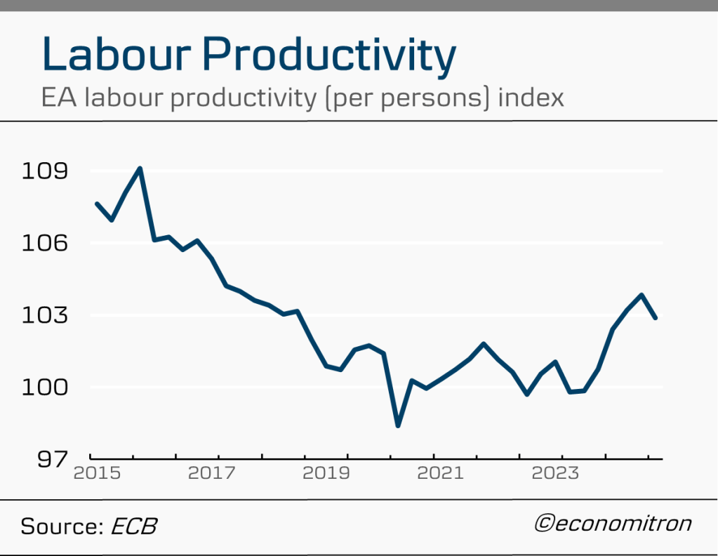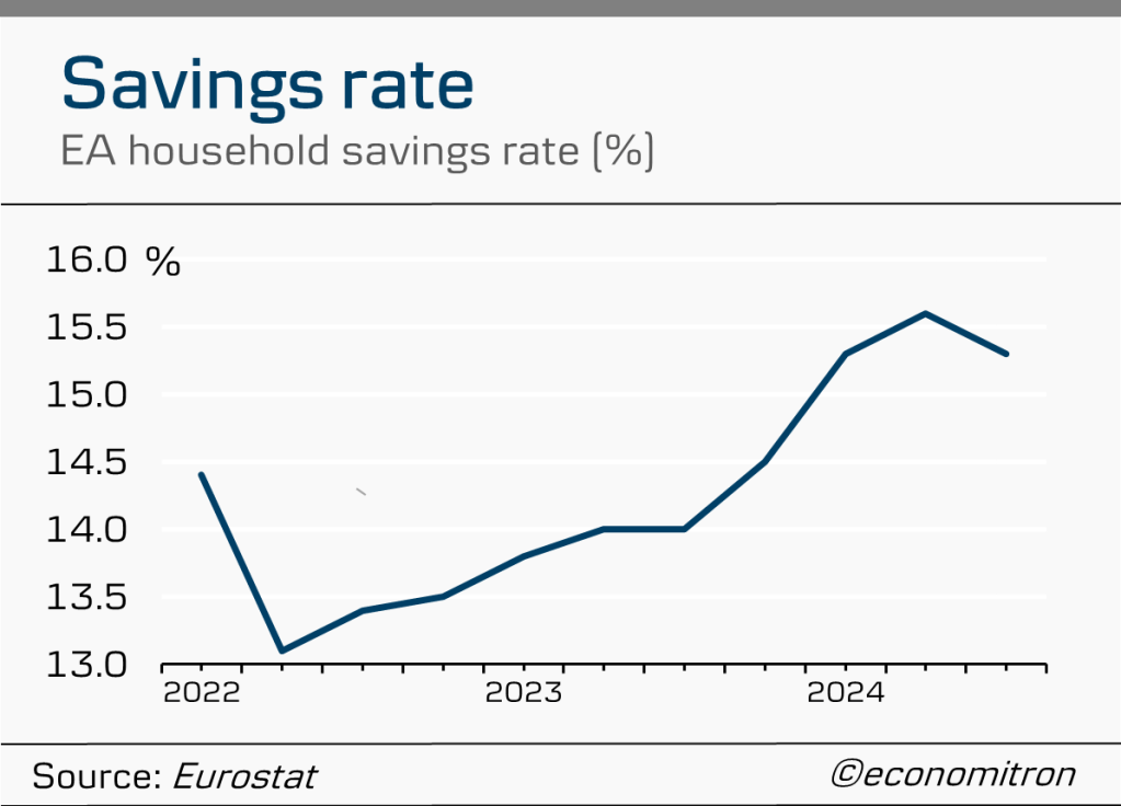 Very few gripes about the state of spending and investment in Europe (as compared to other trading partners such as the US) are summarised quite as well as by the elevated savings rate of eurozone households. Despite easing financing conditions, it still stands well over 2 percentage points above the pre-pandemic average of 12.9%. Consumer confidence remains gloomy.