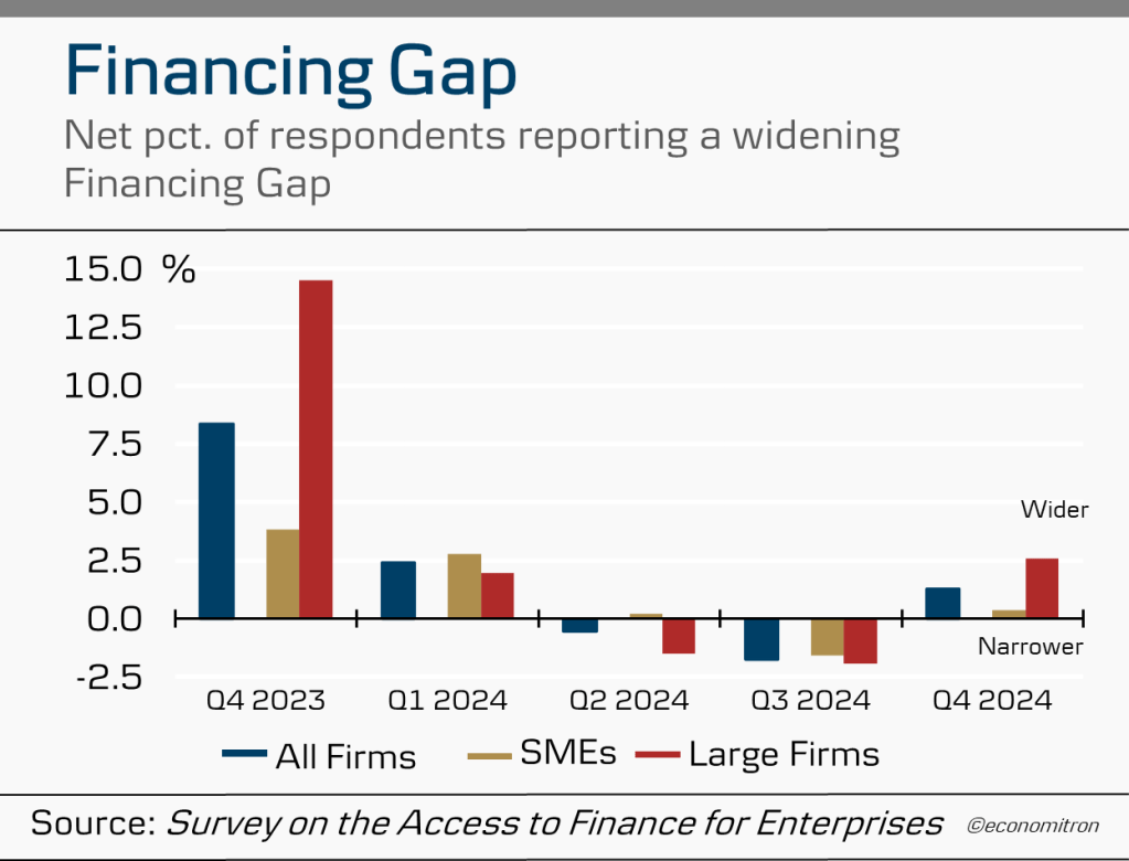 A narrower financing gap (the smaller difference between firms’ liquidity needs and what they are able to receive) also indicated diminishing credit standards from banks in 2024.