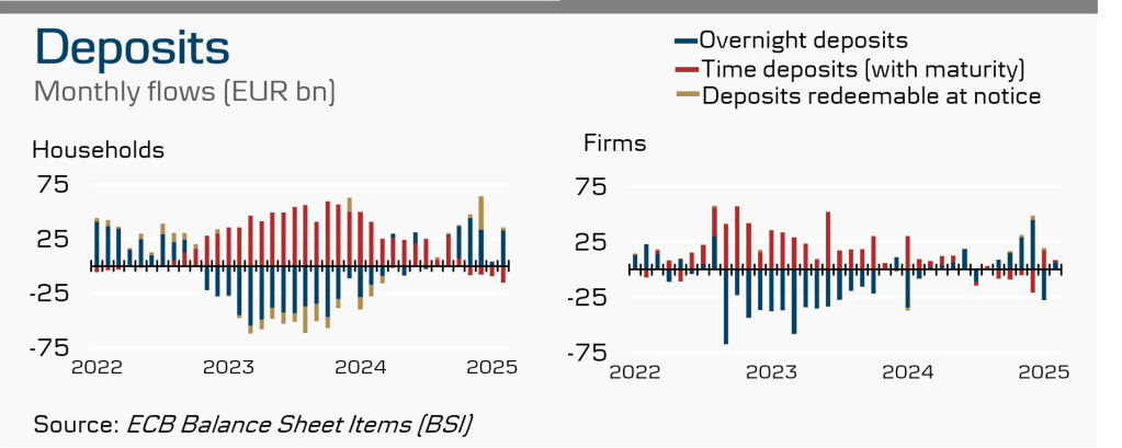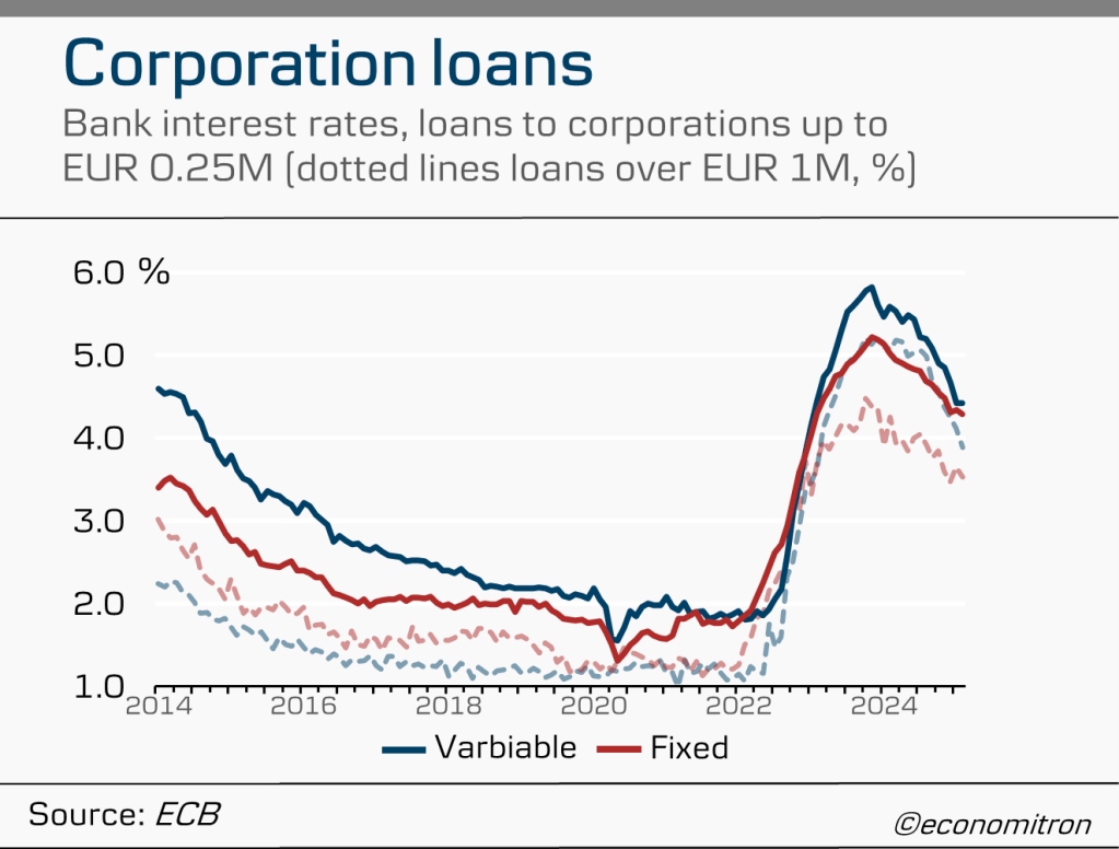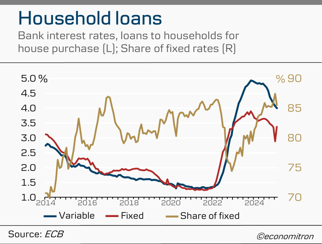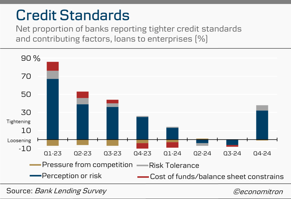 Coming from a two-year tightening period, financing conditions have been easing. However, both credit standards for loans to enterprises and consumers tightened in the fourth quarter of 2024, as reported by the latest Bank Lending Survey. Risk perceptions due to the economic outlook and borrowers’ creditworthiness were the leading contributor in tighter credit standards, with a net 38% of banks citing concerns over risk in loans to enterprises.