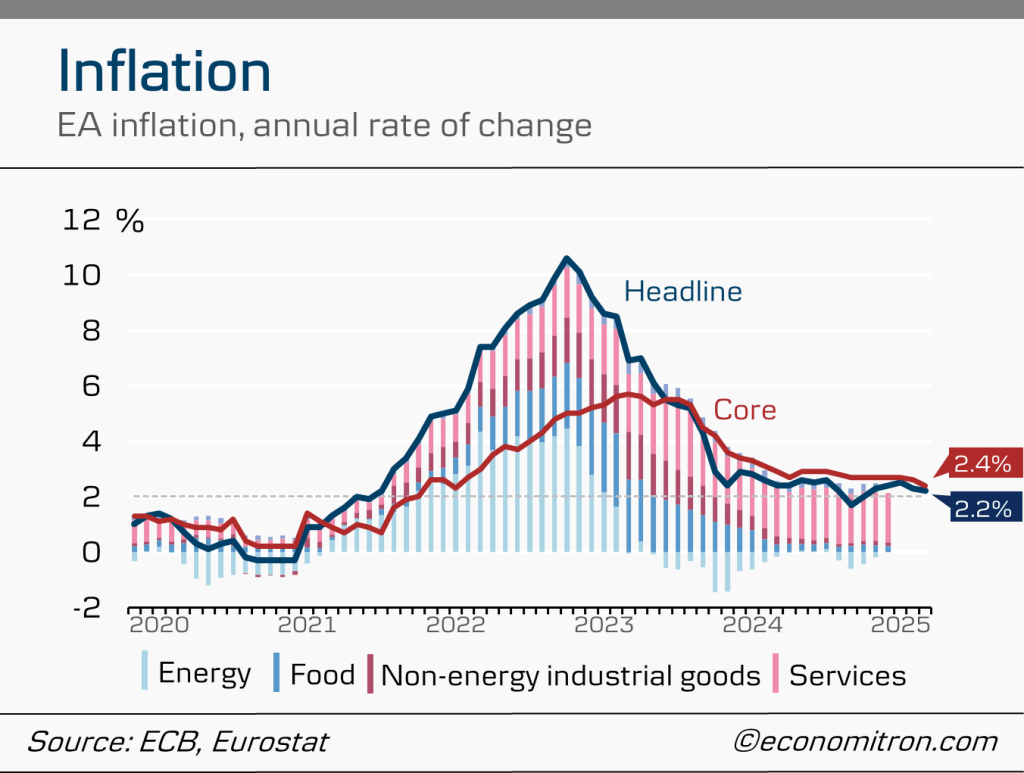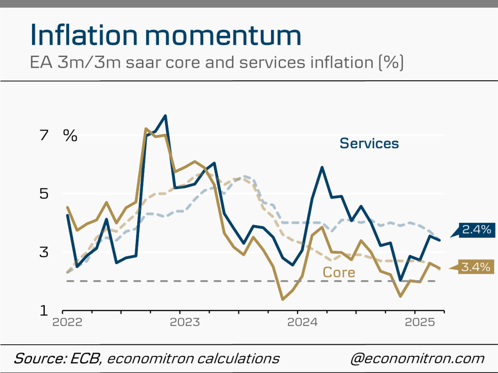 Inflation is slowly creeping towards the ECB’s 2% medium-term target, with price developments in March pointing to a 2.2% annualised increase in prices. Core inflation, which excludes volatile elements such as energy and food (thus providing a more accurate image of underlying inflation dynamics), is still higher at 2.4%.
