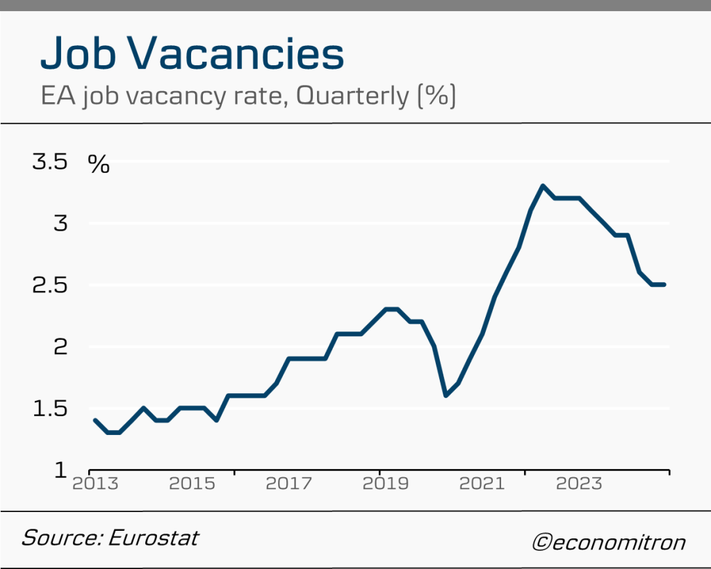Weakening demand has been further reflected by falling job vacancies, which stood at 2.5% in Q4. This is down from over 3% at the peak of the tightness as firms’ demand for labour recedes. Diminishing job vacancies are a crucial sign of easing labour market tensions, as labour shortages are key instigators of labour hoarding and hence tightness.