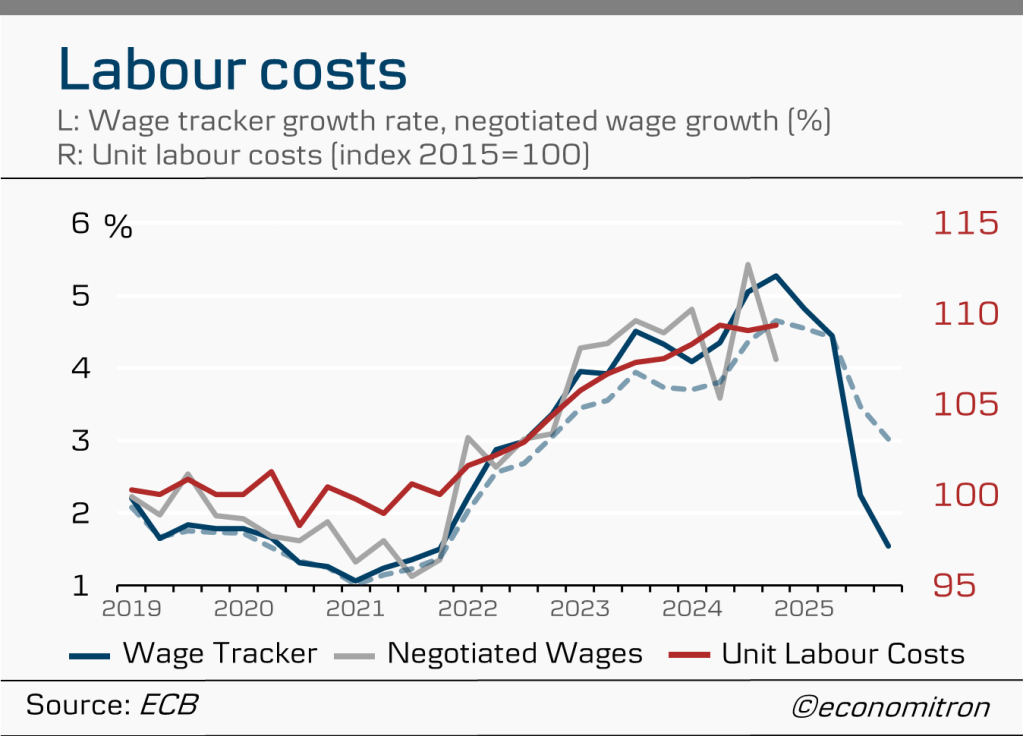 Accordingly, as labour market tightness subsides, labour costs are also tapering down, mainly being driven by the lagging effects of previous inflation episodes. The ECB’s wage tracker excluding one-off payments such as indexation or back-dated pay (shown by the dotted line) currently stands half a percentage point below the headline tracker. This indicates that underlying headwind pressures on services inflation are easing. This is mirrored by both the rate of growth of negotiated wages (which are a component of the wage tracker) and the unit labour cost index seemingly having hit their peak.