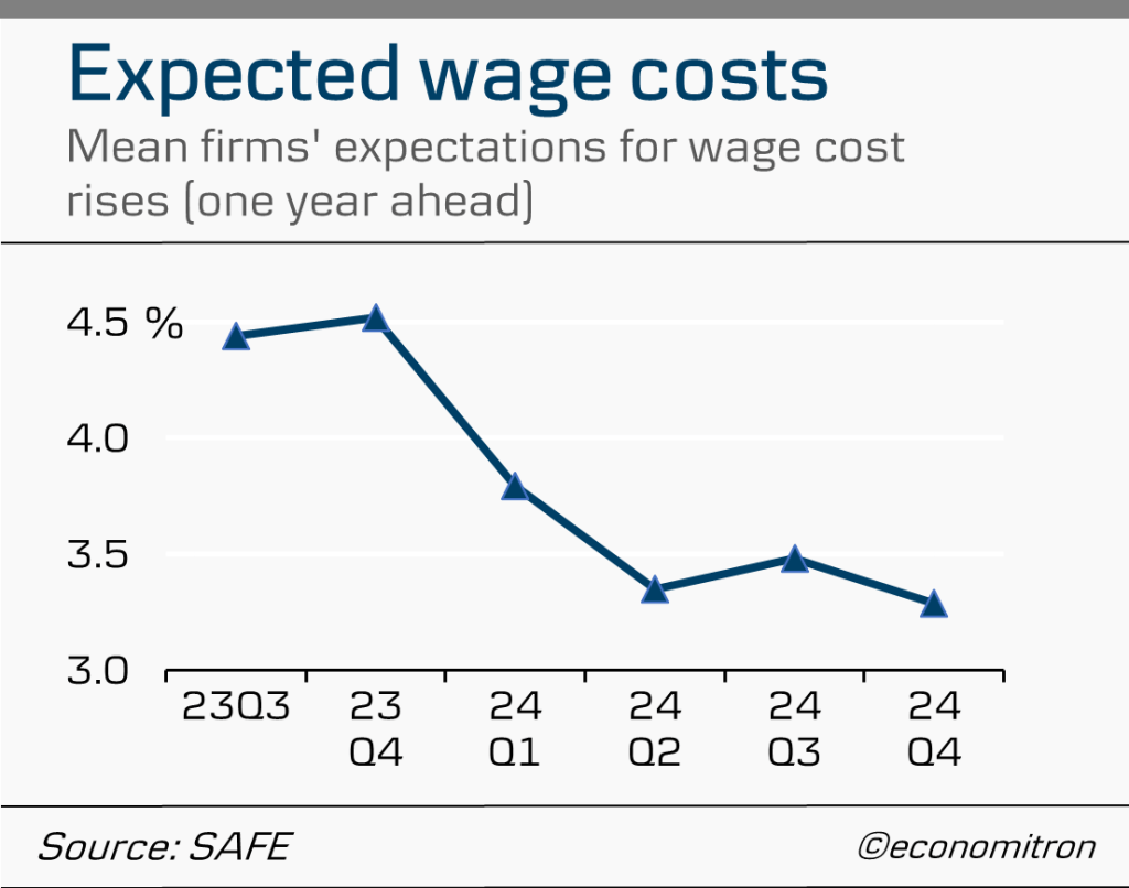 Going forward, wage pressures are expected to moderate as inflationary effects fade. Firms’ average expectations for future wage costs are receding, with an average expectation of 3.3% rise in the upcoming year. This is compared to 4.5% twelve months ago.