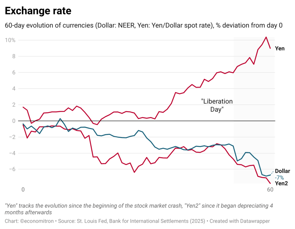 First up, stocks. A good gauge of not only current market sentiments but of expectations for the future. Taking the new administration’s inauguration day to be day 0 for the US, and setting the day the Japanese stock market peaked prior to its crash (December ’89) for Japan’s baseline, both economies display similar trends. The tumble in the American index is especially remarkable on the so-called “Liberation Day” when trade restrictions where announced. Whilst in Japan stocks kept falling and falling afterwards, the start is not looking too good for a president who took remarkable pride in a booming market during his first administration.