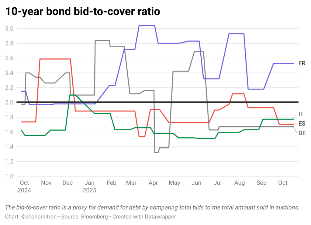A revolving door of French prime ministers has not quelled market demand for its debt—quite the opposite, as the chart above shows. Higher borrowing costs that have accompanied three credit rating downgrades in the past year have increased investor appetite in what usually is a low margin environment.