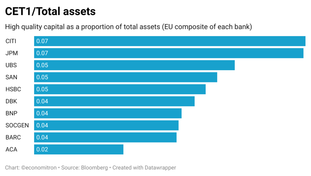 As pointed out by an ECB blog post, constrains in these dealer’s balance sheets could pose a limit to how much increased volume they will want to absorb. Some primary dealers are, as shown below, exhibiting balance sheets that are highly leveraged. Whilst this raw indicator does not show risk, the implication is that they will be growingly unwilling to stretch equity over more and more assets and dilute their buffers––thus possibly taking on fewer sovereign exposures.